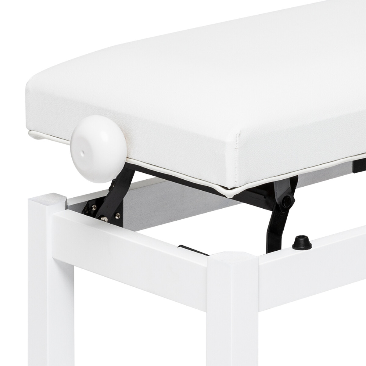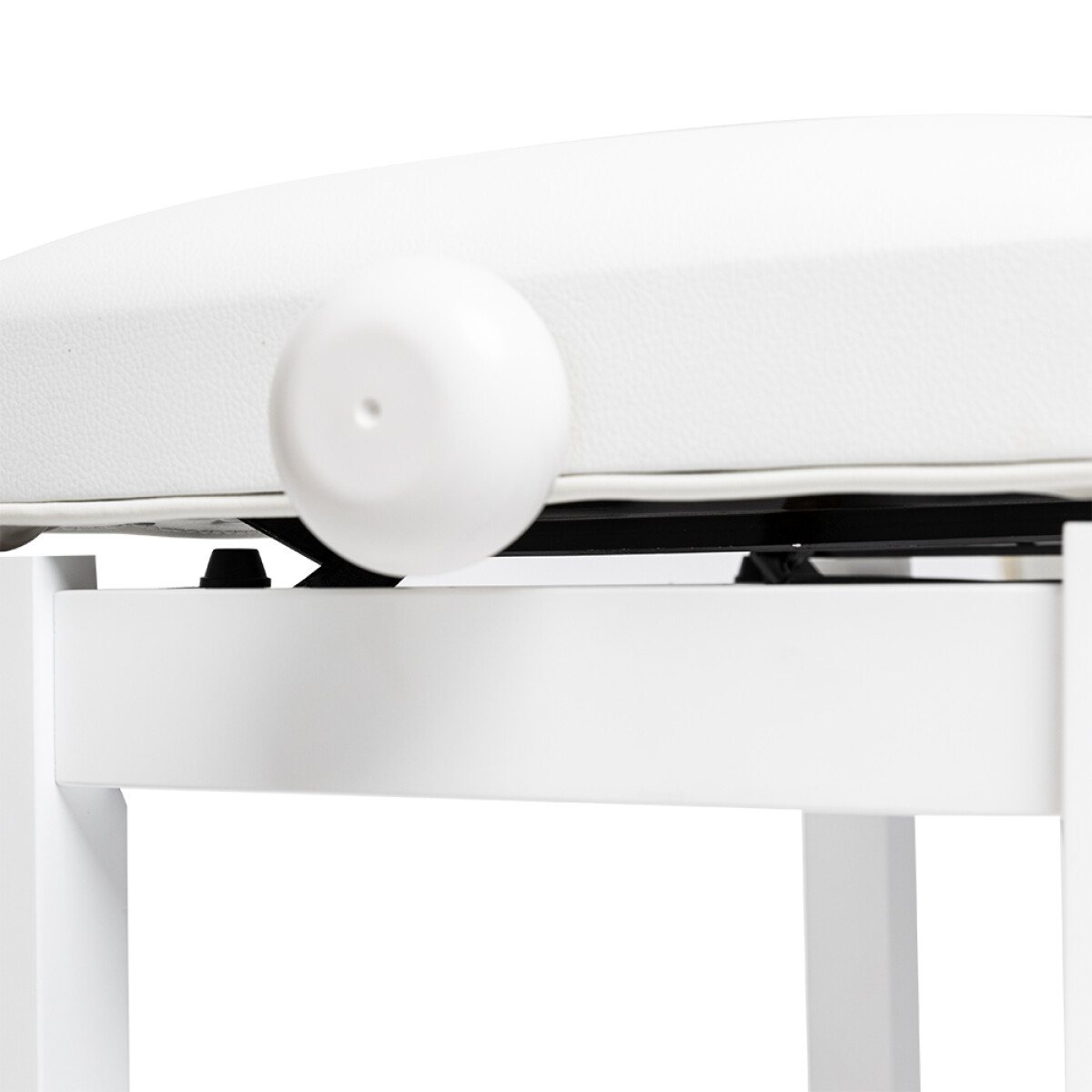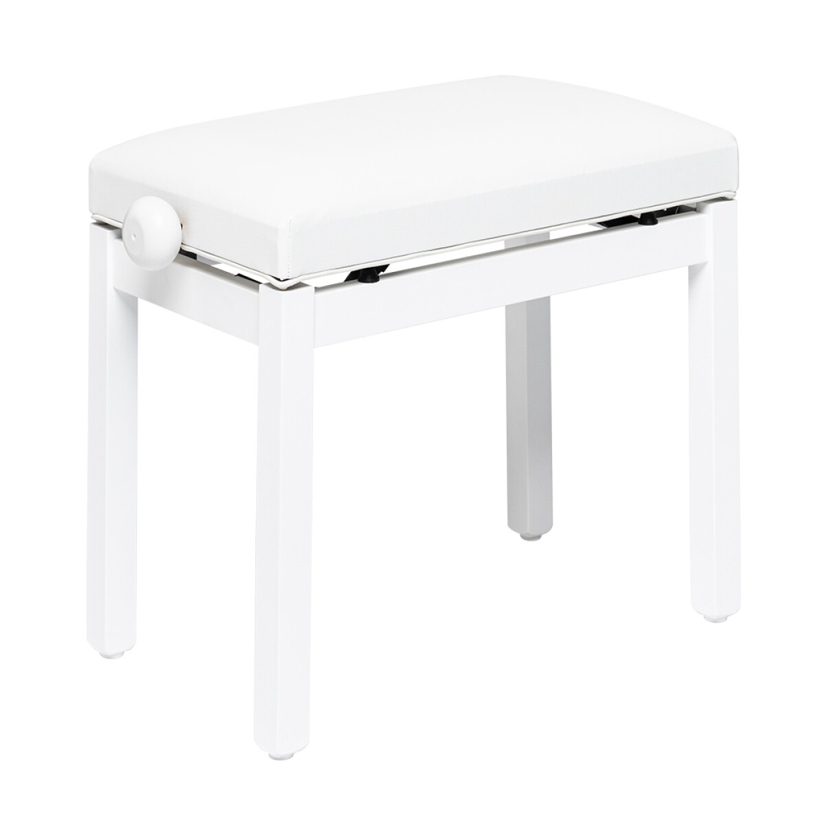 Matt white piano bench with white vinyl top - Structure: Oak - Adjustable height: 49 - 56 cm (19.3 - 22") - Top dimensions: 56 x 33 cm (22 x 13") - Max static load capacity: 200 kg (440 lb) - Weight: 7.7 kg (17 lb)