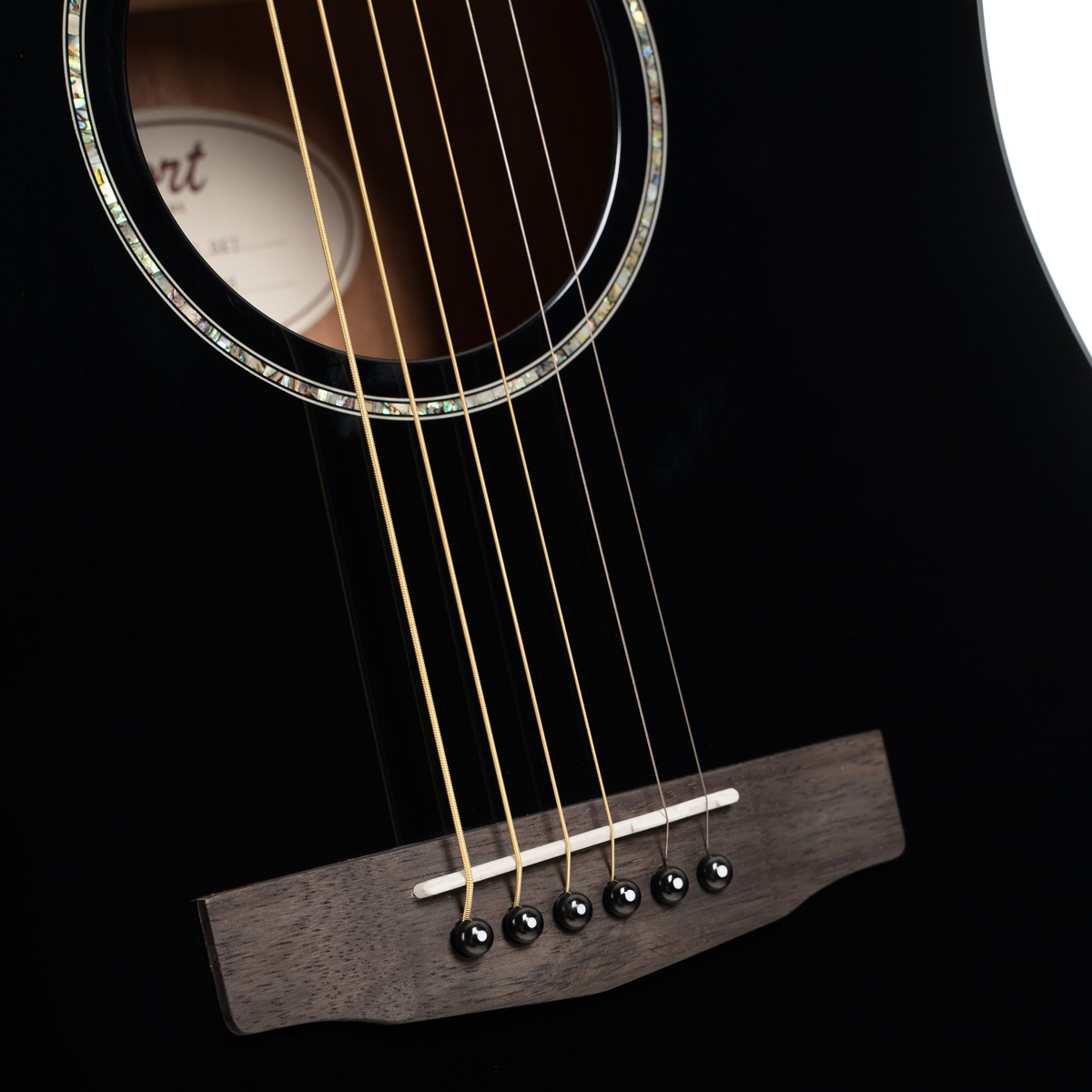Den elegante abalone-rosetten, hvite purflingen og sorte bindingen gir Earth60 et klassisk, tidløst utseende som